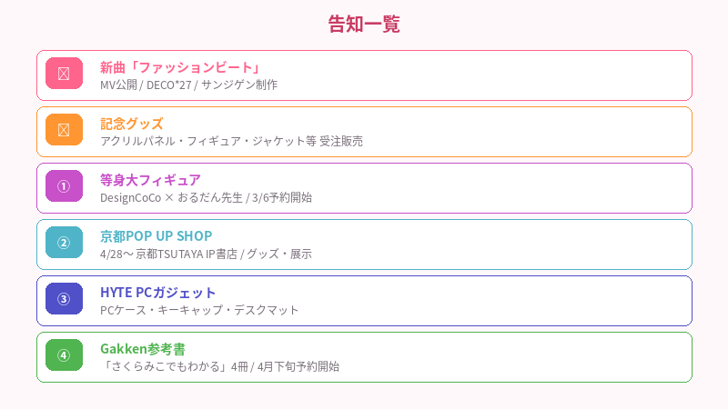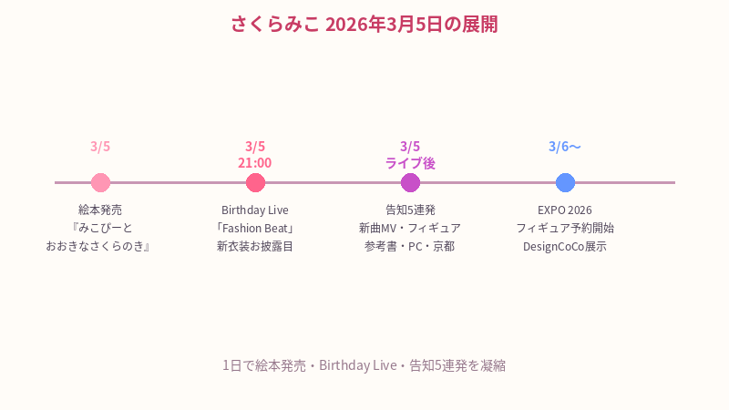 2026年3月5日に配信されたさくらみこ生誕祭2026 3D LIVE「Fashion Beat」で、怒涛の告知が発表された。新曲MVの公開と記念グッズの販売開始に加え、4つの「特報」が解禁──合わせて5つの発表が一夜で飛び出した形だ。ひとつずつ整理していく。