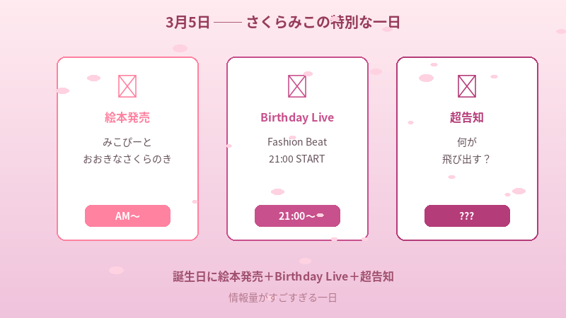 絵本の発売、Birthday Live、新衣装、超告知──3月5日のさくらみこは情報量がすごすぎる。「Fashion Beat」というタイトルからどんなステージ演出が来るのか楽しみだし、毎年期待を超えてくる生誕祭だけに今年もただでは済まないだろう。今夜21時、モニターの前で待機だ。